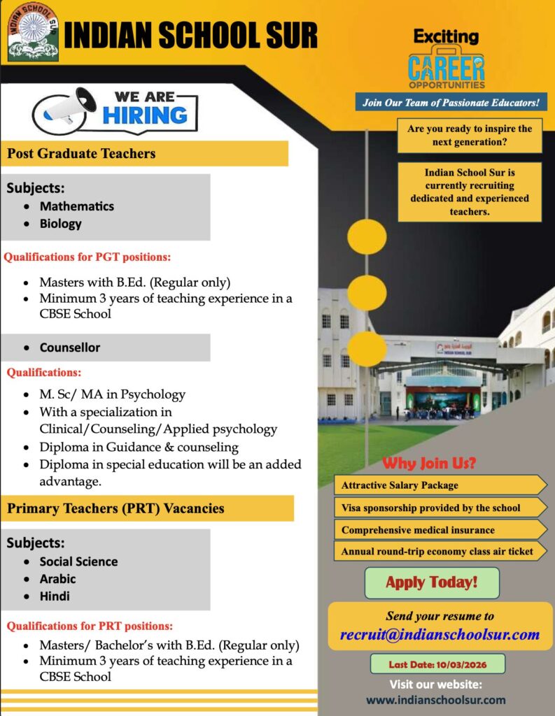 The Indian School SUR, a premier educational institution affiliated to CBSE, Delhi, having a student strength of more than 1000 invites applications for the following Academic staff positions: |